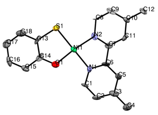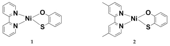 The synthesis of 1 and 2 was performed according to literature procedures for the mononuclear heteroleptic Ni(II) complexes with slight modifications and isolated as sole products [53,55,56,57,58,59]. The samples’ purities were confirmed by elemental analyses and high-resolution mass spectroscopy. The molecular structure of 2 was resolved by X-ray diffraction.