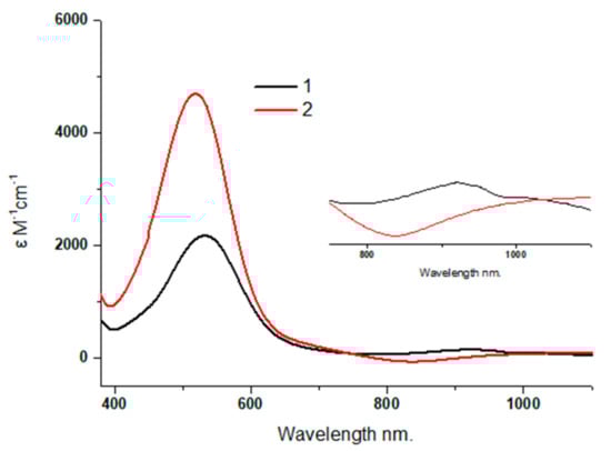 The IR spectra of 1 and 2 (Figure S1) display sharp bands at 630 cm−1 and 635 cm−1, respectively, corresponding to ρ (rocking out of plane) of the mp ligand [60]. The typical νC-S stretching frequencies are observed at 1048 and 762 cm−1 for 1 [39], and at 1074 and 758 cm−1 for 2 Ref [39,61]; whereas the torsion frequencies of C-C and C-N of the bipyridine ligands are displayed at 722 cm−1 and 731 cm−1 for 1 and 2, respectively [62]. The strong peaks in the region between 1650 cm−1 and 1300 cm−1 are due to the νC-C and νC-H of diimine ligands, suggesting their complexation to metal ion. The νNi-S and νNi-O stretching frequencies are usually observed under 450 cm−1; thus they are not displayed in the given IR spectra. The νC = C at 1438 cm−1 and 1460 cm−1 for complexes 1 and 2, respectively, are in accordance with the dianionic form of the mp ligand [60]. The IR spectra fully support the molecular structures given in Figure 1. The high resolution QToF electrospray mass spectra in positive mode in CH3CN show ion peaks at m/z 339,010 and at 367,011 for 1 and 2, respectively, and isotope distribution patterns (Figure S2a,b) which are in accordance with the proposed structure of both complexes. Figure 2 illustrates UV-Vis spectra of both complexes in DMF indicating three transitions for 1 and two for 2. The transition bands at 532 nm (ε = 2178 M−1cm−1) and 519 nm (ε = 4698 M−1cm−1) for compounds 1 and 2, respectively, are assigned as ligand-to-metal charge transfer (LMCT) indicating a rather high molar absorptivity compared to the homoleptic complexes. On the other hand, the absorption band at 920 nm (152 M−1cm−1) for 1 and at 1020 nm (87 M−1cm−1) for 2 is attributed to a ligand-to-ligand charge transfer (LLCT) transition, namely from mp ligand to bpy one [63,64]. Moreover, the CH3 substituents on bpy ligand cause a red shift to these LLCT bands (2 vs. 1), as has already been observed in dithiolene complexes [9,65,66]. A third band appeared at 1008 nm for complex 1 with ε = 77 M−1cm−1. The low molar absorptivity values of the LLCT bands further support the dianionic form of the mp ligand [48,67,68].