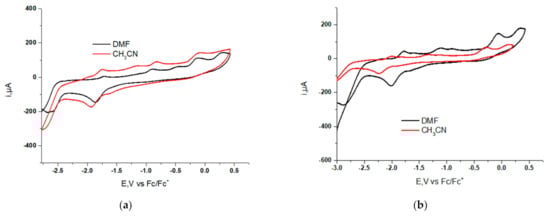 Cyclic voltammograms of (a) 1 (10−3 M) in DMF (black) and in CH3CN (red), (b) 2 (10−3 M) in DMF (black) and in CH3CN (red), 0.1 M n-Bu4NPF6, a glassy carbon as a working electrode, an Ag/AgCl as a reference electrode and a Pt wire as a counter electrode. The scan rate was 100 mV/s.