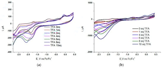Complexes 1 and 2 were examined with respect to their electrocatalytic activity towards proton reduction (Figure 5 and Figures S9–S16). Cyclic voltammograms were obtained in DMF solutions using 0.1 M n-Bu4NPF6 as supporting electrolyte, a glassy carbon as a working electrode, platinum wire as a counter electrode and Ag/Ag+ as a reference electrode. All the potentials in this study were given vs. Fc/Fc+ and trifluoroacetic acid was used as the proton source (pKa = 6.0 in DMF) [79].