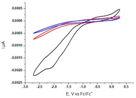 Rinse tests for 1 in the presence of 12 mM of TFA: (black) cyclic voltammogram in the presence of catalyst (10−3 M); (red) cyclic voltammogram in the absence of catalyst vs. Fc/Fc+ after linear sweep voltammetry; (blue) cyclic voltammogram in the absence of catalyst vs. Fc/Fc+ after 3 min potential application (glassy carbon working electrode).