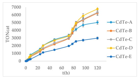 The TGA CdTe-QDs system was evaluated in terms of the catalysts’ concentration from 10−4 to 10−6 with the best results to be taken for 5 × 10−6 M of both the catalysts. Unfortunately, higher concentrations could not be used for solubility reasons. Furthermore, the electron donor’s concentrations (AscOH and TEOA) seemed not to affect the catalytic activity of the systems (Tables S3 and S4).