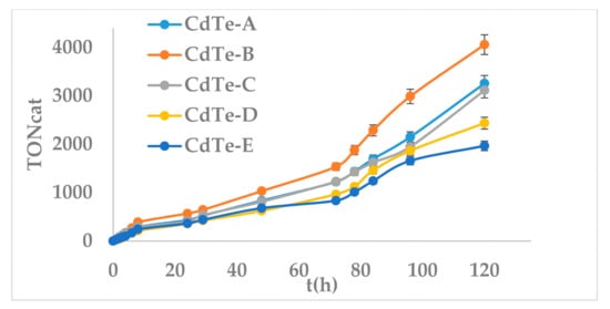 In the first set of the photocatalytic experiments containing TGA-QDs as PS and 1, 2 as catalysts with a solvent system of DMF:H2O (1:2), two different electron donors were added, triethanolamine (TEOA) at pH = 10.55 and ascorbic acid (AscOH) at pH = 4.5 and the obtained data are given in Tables S3 and S4, respectively. The given pHs refer to the final pH of the solution after the dissolution of the corresponding electron donor. The absorbance and emission spectra of QDs-TGA were also obtained after the addition of the TEOA or AscOH (Figures S18 and S19). As can be noticed, an increase in the fluorescence intensity of quantum dots with the addition of ascorbic acid took place, which may be due to its interaction with the coat of the QDs, namely, the thiolyglycolic acid. The differently sized CdTe-QDs were evaluated, keeping the ratio of the solvents and the concentrations of QDs and catalysts unchanged. When TEOA was used as electron donor, the highest TONCat was 967 obtained for QDs-A for complex 1 and 103 obtained for QDs-E for complex 2 (Tables S3 and S4, Figures S20 and S21). Replacing TEOA by AscOH, the amount of evolved hydrogen was impressively increased for both complexes under the same conditions with 6781 and 4057 TONcat for complex 1 and 2, respectively (Figure 7 and Figure 8). Moreover, the QDs with the smallest size except for QDs-E, in a system with catalyst 1, had the lowest catalytic activity revealing the catalytic activity and size relation due to a reduced surface charge density [92,93]. It is worth noticing that in all cases, when QDs are used as photosensitizer, there is an increase of the catalytic activity at around 24 and 80 h. This observation, if it is not a systematic error, is difficult to be explained, especially since the received UV-Vis spectra indicate that the system is rather stable after 120 h of irradiation (Figures S22 and S23).