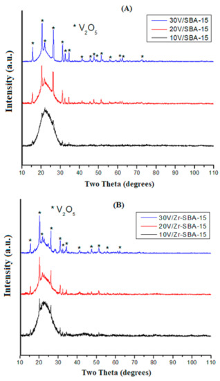 The vanadia dispersed on SBA-15 or Zr-SBA-15 catalysts were prepared by the wet impregnation method. First, 5 g of SBA-15 or Zr-SBA-15 solid were impregnated with 150 mL aqueous solution containing a calculated amount of ammonium metavanadate (NH4VO3, 99%, Sigma-Aldrich, Toluca, Mexico) in order to obtain the vanadia load of 10, 20, and 30 wt% in the final catalysts. 1 g Surfacpol 9030-S (70%, Mexico City, Mexico) was added in order to lower the surface tension of the solution. The suspended mixture was heated at 95 °C in a rotary evaporator. After water was evaporated, the solid powders were dried at 110 °C for 12 h and then calcined at 500 °C for 6 h in air flow. The obtained solids termed as nV/SBA-15 and nV/Zr-SBA-15 catalysts (sometimes, they are also written as nV2O5/SBA-15 or nV2O5/Zr-SBA-15) where n indicates the V2O5 weight percentage.