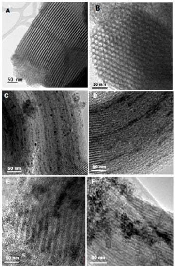 Figure 5. TEM micrographs. (A) BA-15; (B) Zr-SBA-15; (C) 30 V/SBA-15; (D) 10V/SBA-15; (E) 10 V/Zr-SBA-15; (F) 30V/Zr-SBA-15.