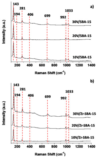 Figure 6. Raman spectra. (a) V2O5/SBA-15; (b) V2O5/Zr-SBA-15.