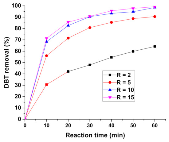 2.6.1. Effect of H2O2/DBT Molar Ratio (R)