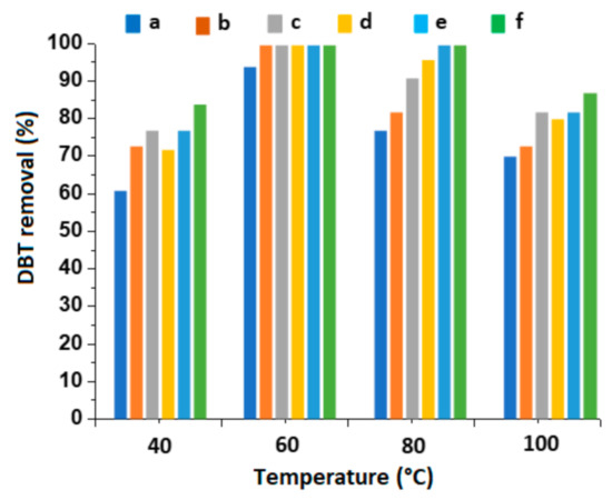 The DBT oxidation was explored at 40, 60, 80, and 100 °C but keeping in the other parameters the same as that reported above (R = 10, catalyst dosage: 1 g/L oil; reaction time: 60 min, volume ratio of oil to acetonitrile 1:1). The results are shown in Figure 8.