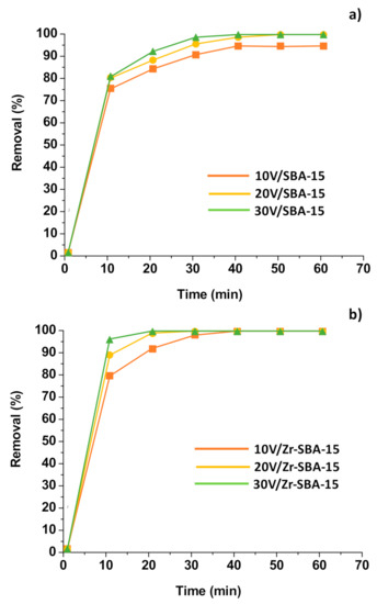 It is noteworthy that the DBT oxidation reaction under the present experimental condition was very rapid. In the first 10 min of reaction, more than 70.0% and 82.4% of DBT were oxidized on the V2O5/SBA-15 and V2O5/Zr-SBA-15 catalysts, respectively (Figure 9). After 30~40 min of the reaction, greater than 95.0% of DBT were removed and the DBT conversion remained almost constant in the following treatment. This is probably related to the rapid generation of surface reactive oxygen species. When H2O2 and catalysts were added into the reaction system, peroxyoxide and superoxide species were rapidly generated on the active sites of the catalyst in the initial stage of the reaction.
