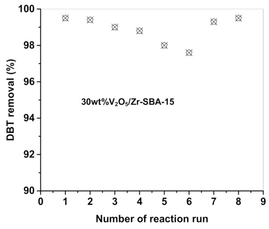 Figure 10 shows the catalytic activity of 30% V2O5/Zr-SBA-15 catalyst evaluated by repeating 8 runs under the optimal reaction condition (60 °C, catalyst concentration 1 g/L oil, R = 10, and reaction time 60 min). At the end of each experiment, the catalyst was filtered and dried, and then used for the next test. We found that the 30% V2O5/Zr-SBA-15 catalyst showed almost the same DBT conversion for the first two recycles, higher than 98.1%. For the reaction that runs from the third to sixth, the catalytic activity slightly diminished by evidenced the DBT conversion decrease by 4–5%.