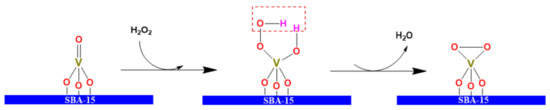 The DBT conversion increased on increasing of vanadia content in the catalysts (see Figure 9). Two possible reasons may be responsible for the enhancement of DBT conversion along with the vanadia content: (i) V5+ ions are the centers of Lewis acidity because they have unoccupied 3d orbitals in the electron configuration, which may also serve as electron acceptors for DBT adsorption. In fact, XPS characterization confirmed that some V4+ ions are formed in the catalysts [38,40]. V4+ ions formation indicated that oxygen defects are created as neighbors of V5+ ions for charge balance. Therefore, oxygen defects are one of the origins of Lewis acid sites; (ii) V5+ ions are the sites for the formation of peroxometallic complexes resulting from the interaction between hydrogen peroxide and unoccupied 3d electron orbitals of V5+. Compared with pure H2O2, the peroxometallic complexes V5+–O–O–H were more stable and more effective for the ODS reaction; because the V–O–O–H bond is unsymmetrical, and the electron density in the O–O bond of V–O–O–H species is unbalanced, thus the dissymmetry O−O bond has strong polarization [64,65,66]. V–O–O–H species may further transfer to the peroxovanadium complexes V–O–O–V by releasing one water molecule (Scheme 1). The electrons were withdrawn from the peroxyl moiety and increased the electrophilic character of the peroxidic oxygens, favoring the oxygen atom transfer to the S atom in the DBT molecule.