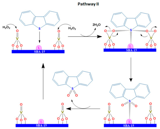 The vanadia concentration and dispersion strongly affects the ODS activity [40]. For the catalyst with moderate vanadia loading, herein 20–30 wt% V2O5, where distance between vanadia crystals may be short due to the higher concentration of surface vanadia nanoparticles. Therefore, two neighboring vanadia nanocrystals may simultaneously participate in the oxidation of the same DBT molecule. This may benefit the DBT oxidation with higher efficiency and more rapid via the Pathway II as described in Scheme 3. In these catalysts, DBT oxidation may proceed via the Pathway I and the Pathway II simultaneously, promoting the rapid and complete ODS reaction. This explains the high catalytic activity of the 30 wt% V2O5/SBA-15 and 30 wt% V2O5/Zr-SBA-15 catalysts. A too-high vanadia loading may lead to poor dispersion and a larger crystallite size that are unfavorable to the enhancement of DBT adsorption and oxidation [38,40]. On the basis of previous experimental experience, we did not investigate the catalyst activity with vanadia content greater than 30 wt%.