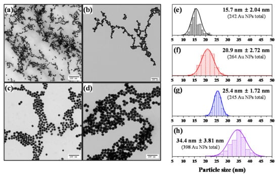 Spherical Au NPs with a size range of 15–35 nm were synthesized with two synthetic methods called the Turkevich method and the seeded-growth method by citrate reduction. Au NPs with a diameter of 15 nm were synthesized by the Turkevich method, which yields a narrow size distribution, whereas Au NPs with diameters of 20, 25, and 35 nm were prepared using the seeded-growth method. Au NPs with a diameter range of 20–35 nm were prepared using the method proposed by Puntes and co-workers [] with some modifications (described in detail in the Methods section). A schematic illustration of the modified seeded-growth method is depicted in Supplementary Materials (Figure S1). In the citrate reduction method, the concentration ratio of citrate to HAuCl4 is a key parameter for controlling the size of the Au NPs. When the concentration ratio of citrate to HAuCl4 was less than 2, the NPs were prone to aggregate such that their sizes increased and their shapes became irregular. However, by increasing the ratio up to 3.5, the size of the NPs further decreased; a further increase in the ratio resulted in a decrease in the size of the Au NPs, followed by gradual saturation []. Figure 1 shows the morphological characterization of the four different sizes of Au NPs prepared using the two methods and respective size distribution histograms. The concentration ratio of citrate to HAuCl4 for the seed solution was determined to be 13, which was decreased to 6.5 by adding 1 mL of HAuCl4 solution. The size of Au NPs in the resulting solution after growth for 30 min, called G1 colloids, was determined to be ca. 20 nm (Figure 1b,f). For the preparation of Au NPs with a size of 25 nm, a set of dilutions and injections was required. The concentration ratio of citrate to HAuCl4 after dilution was determined to be 11, which is close to the ratio of the Au seed, and it was determined to be 5.5 after the addition of 1 mL of HAuCl4. After 30 min of growth, the size of the Au NPs in the resulting solution, called G2 colloids, was determined to be ca. 25 nm (Figure 1c,g). An additional cycle of dilution and injection was performed to obtain Au NPs with a size of ca. 35 nm, called G3 colloids (Figure 1d,h). The ratios in the final set of solutions were determined to be 10 and 5, respectively. The concentration ratio of citrate to HAuCl4 was maintained during three consecutive growth steps. The size of Au NPs prepared by the conventional Turkevich method was determined to be ca. 15 nm with a very narrow distribution (Figure 1a,e). The average size and size distribution (standard deviation) of the synthesized Au NPs were determined from at least 240 randomly selected NPs from random areas of the transmission electron microscopy (TEM) grid. Based on the TEM results, we confirmed that well-dispersed spherical Au NPs were synthesized and their standard deviation was mostly within ±2 nm, which is a very narrow distribution.