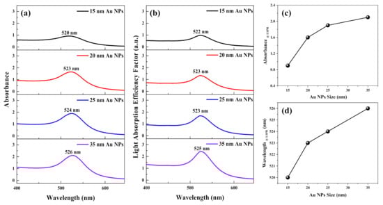The surface plasmon resonance features of the Au NPs prepared with four different sizes were examined by ultraviolet-visible (UV-Vis) absorption spectra, and we compared these spectra for each Au NP using the NANODDSCAT+ simulation tool. Figure 2a shows the extinction spectra of the as-prepared citrate-stabilized Au NPs, whose absorption bands for different sizes appeared at 520, 523, 524, and 526 nm. To further understand the optical properties of Au NPs with different sizes, we employed the open-source NANODDSCAT+ code from nanoHUB.org []. This simulation code, based on the discrete dipole approximation (DDA) method, was designed to study the LSPR spectrum and electric field of plasmonic NPs []. LSPR simulation results for Au NPs with different sizes are shown in Figure 2b. The simulated absorption spectra of the Au NPs appeared at 522, 523, 523, and 525 nm. It should be noted that the dielectric constant of the capping agent, citrate, as a function of given wavelength was not considered in the simulation because the density of the capping agent in the vicinity of Au NPs with different sizes was uncertain. However, the peak of the LSPR band and the tendency in the peak shift in the simulated results are in good agreement with the experimental results. Figure 2c,d show the peak absorbance and maximum LSPR wavelength of the as-synthesized Au NPs. As can be seen, the absorbance gradually increased, and the wavelength shifted to a longer wavelength as the size of the Au NPs increased. As anticipated, following the Mie theory, the surface plasmon resonance band of Au NPs shifted to a longer wavelength and its intensity increased with the increasing Au NP size.