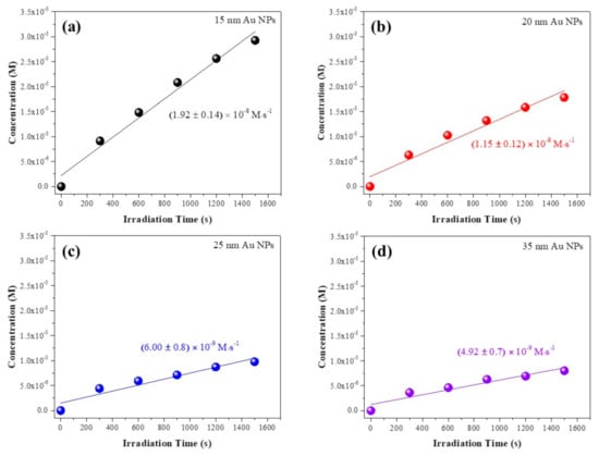 Au-catalyzed photochemical reaction under 532 nm light excitation with a power of 700 mW. Concentration (M) as a function of irradiation time for (a) 15 nm, (b) 20 nm, (c) 25 nm, and (d) 35 nm Au NPs. The values in each figure are reaction rates determined by linear fitting for each experiment.