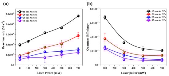 The quantum efficiency of the photochemical reaction by electron transfer is defined as the efficiency of converting absorbed light into chemical transformation []. Typically, the quantum efficiency in photocatalytic reactions decreases exponentially with an increase in the number of incident photons. While charge separation and fast recombination events continuously occur under light excitation, the rate of electron transfer is governed by the diffusion of chemical substances in the reaction. Even if a large number of electrons are generated at a high power, most of these excited electrons quickly recombine and do not participate in the chemical reaction, resulting in a steep decrease in quantum efficiency. Figure 4b shows the calculated quantum efficiency for each Au NP size as a function of laser power, and the quantum yield values are summarized in Table 1. At the lowest laser power (100 mW), the calculated quantum yield for 15 nm and 35 nm Au NPs was estimated to be ca. 6.78 × 10−5 and ca. 2.33 × 10−5, respectively. The quantum yield gradually decreases and then stabilizes, eventually saturating as the incident number of photons increases. These tendencies of quantum yield as a function of laser power were identically observed for all sizes of Au NPs. The quantum yield at the highest power (700 mW) for 15 nm and 35 nm Au NPs was estimated to be ca. 2.33 × 10−5 and ca. 6.50 × 10−6, respectively. Interestingly, the quantum yield of the smallest Au NPs used in this experiment was three times higher than that of the largest Au NPs under all irradiation conditions. These results indicate that 15 nm Au NPs can convert chemical substances more efficiently under the same amount of light absorbed.