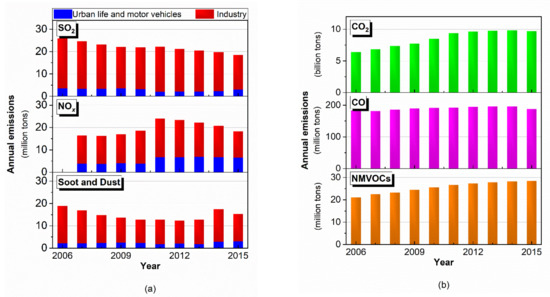Various pollutant emissions in China from 2006 to 2015 [8,9,10]. (a) the annual emissions of SO2, NOx and soot in china, and (b) the annual emissions of CO2, CO and NMVOCs in china.