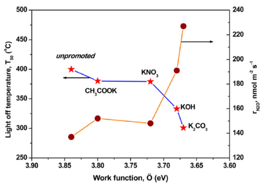 The precursors of commonly used K include K2CO3, KNO3, CH3COOK, KOH, etc., as shown in Figure 5 [35,68]. The promotion of activity on Co3O4 has the following relationship: K2CO3 > KOH > KNO3 ≈ KHCO3 > CH3OOK > > K2SO4 ≈ KCl. When K2CO3 is used as a precursor, the lowest light off temperature and the highest reaction rate are obtained with the lowest work function [69]. The poor performance of K2SO4 and KCl is due to the adsorption of SO42- and Cl- on the surface defects, which hinders the decomposition of N2O.