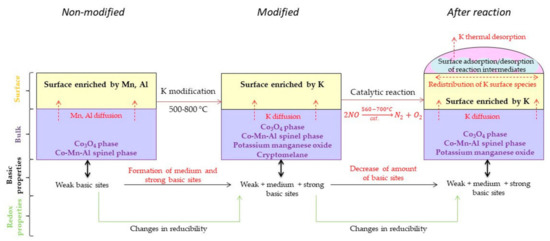 As K loaded on Co-Mn-Al catalyst, the changes well reflect the effect of K on the NO decomposition [73], as shown in Figure 6. K modification makes the surface of catalyst rich in potassium species, which increases the number of basic sites, especially the medium and strong basic sites. K also promotes the formation of active Co2+ sites and the adsorption of NO. The increase of catalyst basicity and reducibility further promotes the catalytic dissociation activity of NO and the desorption activity of O2.