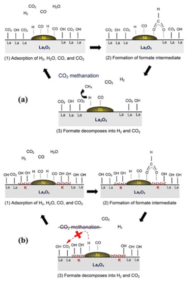 - Osaki, T.; Mori, T. Role of Potassium in Carbon-Free CO2 Reforming of Methane on K-Promoted Ni/Al2O3 Catalysts. J. Catal. 2001, 204, 89–97. [Google Scholar] [CrossRef]