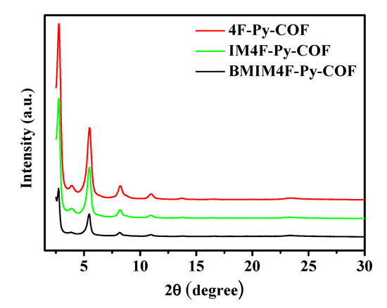 The crystalline nature of all the COFs was confirmed by powder X-ray diffraction (PXRD) measurements. IM4F-Py-COF exhibited strong diffraction peaks at 2.8°, 3.8°, 5.5°, 8.2°, 10.9°, 13.7°, and 23.2°, which were attributed to the (110), (020), (220), (330), (400), (550), and (001) facets, respectively (Figure 1a, red curve). The use of lattice modeling (Figure 1a, magenta curve) and Pawley refinement processes produce an eclipsed AA stacking model that reproduced the PXRD pattern very well with Rwp of 2.9% and Rp of 1.6% (Figure 1a, black curve). The Pawley refinement using the unit cell parameters of a = 49.83 Å, b = 42.60 Å, c = 3.93 Å, and α = β = γ = 90°, confirmed the peak assignment, as evidenced by the negligible difference (Figure 1a, blue curve). By contrast, an alternatively staggered AB model did not match the observed data (Figure 1a, olive curve). A schematic arrangement structure was shown in Figure 1b. Moreover, identical PXRD patterns were also observed for BMIM4F-Py-COF and 4F-Py-COF, suggesting that these three COFs possess similar crystal structures (Figure 2). The slight decrease in the diffraction peak intensity of BMIM4F-Py-COF was attributed to the occupation of the pores by the grafted n-butyl groups.
