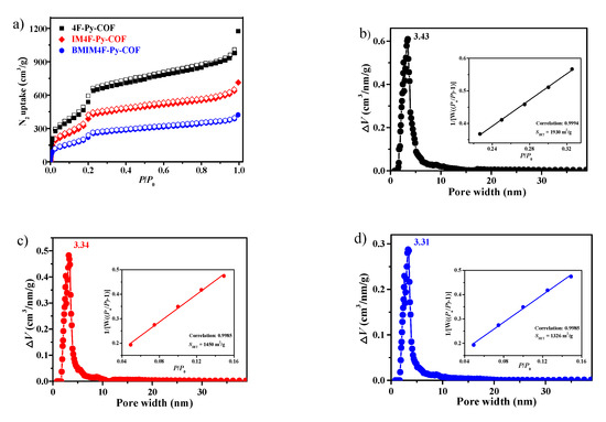 The porous properties of all the COFs were characterized by nitrogen adsorption–desorption isotherms measured at 77 K. As shown in Figure 4a, the three COFs exhibited the typical type-IV adsorption isotherms, indicative of mesoporous characteristics. The BET surface areas were measured to be 1930, 1450, and 1326 m2 g−1, and the pore widths were calculated to be 3.43, 3.34, and 3.31 nm for 4F-Py-COF, IM4F-Py-COF, and BMIM4F-Py-COF, respectively (Figure 4b–d). Their corresponding total pore volumes were calculated to be 1.82, 1.11, and 0.65 cm3 g−1, respectively (Table 1). Based on the PXRD and adsorption isotherm results, it is evident that the ordered framework structure remained after modification.