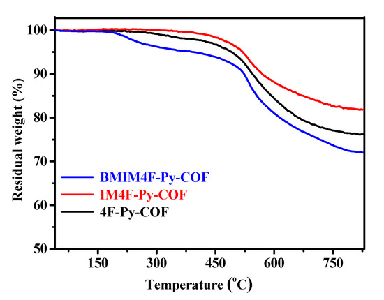 The thermal behavior of the three COFs was detected by thermogravimetric analysis (TGA). It can be seen from Figure 5 that all the materials decomposed at a temperature above 450 °C, indicating their good thermal stability. The decomposition temperature of IM4F-Py-COF is higher than 4F-Py-COF. This result suggests that strong interlayer interaction stemming from a fluoro-substituted and non-substituted unit combination leads to high thermal stability. After the ionization modification, the thermal stability slightly decreased, as reflected by the weight loss at ca. 200 °C, which may be attributed to the decomposition of an ionic moiety attached to the channel walls. However, the frameworks still remain at high thermal stability (>450 °C). Therefore, it is practicable for BMIM4F-Py-COF to be used as a pre-catalyst for the transesterification of glycerol with dialkyl carbonates.