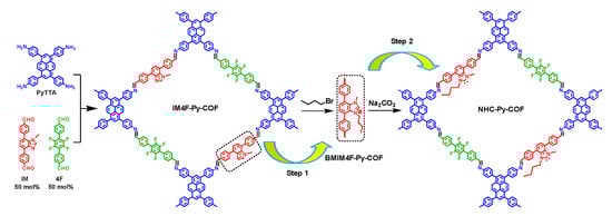 An imine-linked COF, IM4F-Py-COF, was initially synthesized via a three-component condensation reaction, in which 4,4′,4′′,4′′′-(pyrene-1,3,6,8-tetrayl) tetraaniline (PyTTA) was used as the vertices and two linear dialdehyde monomers, namely 4,7-bis(4-formylphenyl)-1-methyl-1H-benzimidazole (IM) and 2′3′5′6′-tetrafluoro-[1,1′:4′,1′′-terphenyl]-4,4′-dicarbaldehyde (4F), were used as edges (Scheme 1). The molar ratio of IM to 4F was set at 1:1 because fluoro-substituted and non-substituted units at an equimolar ratio would produce the strongest self-complementary interlayer interactions [83]. As a control, 4F-Py-COF was also prepared through the condensation of 4F and PyTTA, i.e., only 4F was used as edges. Post-synthetic modification of IM4F-Py-COF was achieved through the quaternization reaction of benzimidazole groups on the skeleton with 1-bromobutane (C4H9Br) to produce ionic BMIM4F-Py-COF, which was then transformed into NHC-functionalized NHC-Py-COF in the presence of NaCO3. In other words, BMIM4F-Py-COF is a pre-catalyst in this research. Each benzimidazole framework can be essentially treated as a discrete molecule to undergo a reaction normally performed in molecular organic chemistry, providing a completely different framework material. The catalytic performance of the resulting NHC-Py-COF was then evaluated by the transesterification reaction of glycerol with dialkyl carbonates and excellent catalytic activity and good recyclability were observed for the NHC-Py-COF.