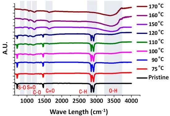 Next, FT-IR was used to explore further chemical structural changes of PE upon sulfonation (Figure 2). Up to 120 °C for sulfonation, the only noticeable change in spectra was the emergence of S–O, S=O, and C–O bond peaks which appeared at 860, 1100, and 1200 cm−1, respectively [16]. Significant changes of spectra could be observed for the 150 °C sulfonated sample, which is concomitant to the result from DSC analysis. A doublet peak at 2840 and 2920 cm−1, representing the C–H bond, completely disappeared. Such change indicates a significant degree of polymer chain cross-linking and therefore supports the DSC results, which suggested possible cross-linking initiation at 150 °C [17,18,19,20]. Further, ketone peak around 1700 cm−1 and O–H single bond peak started to appear with the simultaneous disappearance of C–H bonds. Changes in O–H and C=O bonds are related to attachment of oxygen functional group and sulfone functional group during the sulfonation process [8,10,21,22].