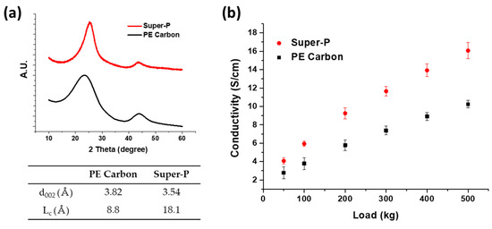 (a) XRD results and (b) electrical conductivity of carbon nanoparticle for PE and Super-P.
