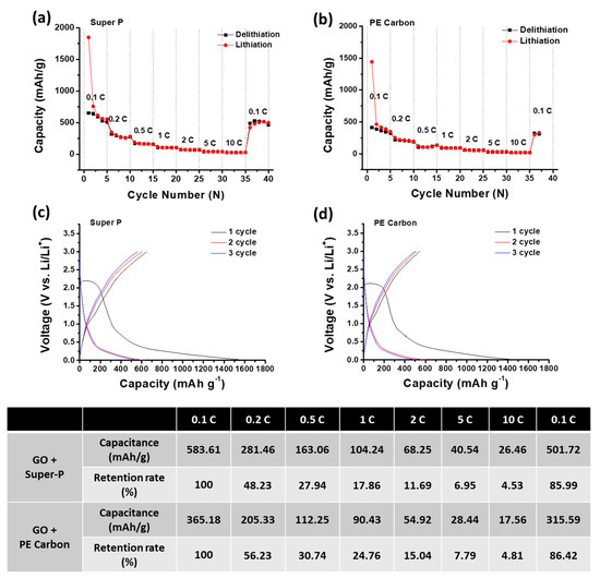 Cell performance of lithium-ion batteries (LIBs) assembled using Super-P and PE carbon as conductive agent. Capacity and the coulombic efficiency (CE) of LIBs from (a) Super-P and (b) PE carbon at 0.1–10 C-rate. Galvanostatic charge/discharge curves of LIBs from (c) Super-P and (d) PE carbon.