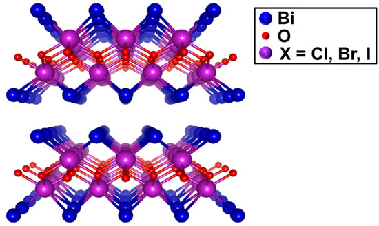 Among the various 2D semiconductors for photocatalysis applications, bismuth oxyhalides (referred to hereafter as BiOX, where X = Cl, Br and I)—a group of V-VI-VII ternary compounds with stoichiometric form—have become the prime choice for researchers owing to their nontoxicity, layered morphology, unique crystal structure, suitable band structure, variable bandgap energy and excellent chemical stability ensuring corrosion resistance in the solution medium for long term operations [14]. The stoichiometric BiOX possessing tetragonal matlockite polymorph (PbFCl-type; space group—P4/nmm) crystallize into layered structures consisting of patterned [X-Bi-O-Bi-X] slices stacked together by the nonbonding van der Waals interaction through the halogen atoms along the c-axis, as depicted in Figure 1. In each [X-Bi-O-Bi-X] layer, the central Bi atom is surrounded by four oxygen and four halogen atoms, generating an asymmetric decahedral geometry [15]. The open crystalline structure, indirect bandgap, strong covalent bonding combined with weak interlayer van der Waals interaction, and excellent electrical, optical and mechanical properties are the features that endow BiOX as a promising candidate for light induced redox reactions [16]. However, poor light absorption, restricted utilization and limited chemical stability are some of the shortcomings of BiOX.