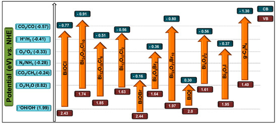 Conduction and valence band (CB and VB) positions of g-C3N4, BiOX, and some of the BixOyXz photocatalysts vs. Normal Hydrogen Electrode (NHE) at pH = 7. The redox potentials of different chemical reactions are compared in this figure.