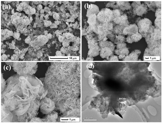 Similarly, g-C3N4/BiOBr microspheres were synthesized by the dispersion of g-C3N4 to a solution made by dissolving Bi(NO3)3•5H2O in ethanol containing a stoichiometric amount of ionic liquid [C16mim]Br (1-hexadecyl-3-methylimidazolium bromide). During the reaction, the ionic liquid [C16mim]Br acted as the solvent, reactant, template and most importantly as a dispersing agent, which ensured the better dispersion of g-C3N4 in the aqueous solution due to electrostatic attraction. As observed from Figure 4, the FESEM and TEM micrographs of the solvothermally synthesized g-C3N4/BiOBr composites exhibited relatively uniform 3D flower-like microspheres with self-assembled nanosheets on their surface, indicating the wide distribution of g-C3N4 on the surface of BiOBr [88,89].