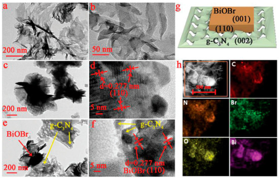 TEM micrographs of (a,b) pristine g-C3N4, (c,d) pristine BiOBr and (e,f) g-C3N4/BiOBr; (g) schematic representation of growth of BiOBr layer over the surface of g-C3N4 forming the heterojunction photocatalyst and (h) elemental maps confirming the growth of BiOBr over g-C3N4. Reprinted from Ref. [99] with permission from The Royal Society of Chemistry.