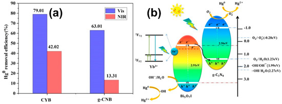 (a) Mercury removal efficiency under visible and near infrared light excitation in the presence of g-C3N4/Yb3+-Bi5O7I (CYB) and g-C3N4-Bi5O7I (g-CNB) as photocatalysts, (b) schematic depicting the mechanism of charge transfer in the Z-scheme heterojunction g-C3N4/Yb3+-Bi5O7I during the photocatalytic oxidation of Hg0. Reprinted from Ref. [108] with permission from American Chemical Society.