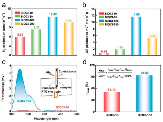 Rate constants for generation of (a) H2 and (b) hydroxyl ions over different BiOCl photocatalysts under simulated solar light irradiation. (c) Surface photovoltage spectra of BiOCl synthesized with time span of 10 h (BiOCl-10) and 100 h (BiOCl-100) indicating the degree of charge separation. (d) Surface charge transfer efficiency of BiOCl-10 and BiOCl-100. Reprinted from Ref. [192] with permission from John Wiley & Sons.