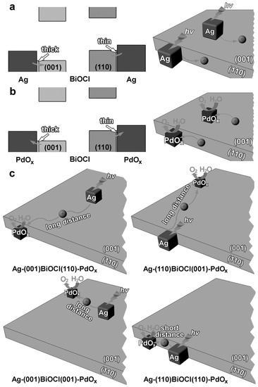 In addition to H2 generation, sunlight-driven photocatalytic water splitting allows the generation of oxygen (O2). However, the water oxidation for O2 evolution is more difficult due to the multistep transfer of four h+ in comparison to the transfer of two e− for H2 generation. The oxygen evolution reaction demands the accumulation of cationic h+ on the surface (i.e., surface-trapped holes), which is absolutely essential to be utilized for the reduction of adsorbed water via H2Oad + 2h+ → 1/2 O2 + 2H+ [195]. The basic requirement for photocatalytic O2 evolution is ensuring that the VB edge of the photocatalyst is located at a more positive position than the oxidation potential of H2O (1.23 V vs. normal hydrogen electrode at pH = 0). Further, a significant overpotential is required for overcoming the activation energies in the charge-transfer process between the photocatalyst and water molecules. Due to the stringent demands, only very few materials are capable of directly oxidizing water into O2 under light irradiation. Di et al. reported the fabrication of atomically thin defect-rich BiOCl nanosheets through the hydrothermal approach by treating pre-synthesized BiOCl nanosheets in ethylene glycol and studied their performance towards the photooxidation of H2O [196]. The amount of O2 generated with defect-rich BiOCl nanosheets (56.85 µmol g−1 h−1) was nearly 3 and 8 times greater than that generated with defect-free BiOCl nanosheets and bulk BiOCl. The enhanced performance of defect-rich BiOCl in the photooxidation of water can be attributed to the synergetic effect of an atomically thin thickness of ~2 nm, defects on BiOCl basal planes shortening the migration distance of holes for promoting charge separation and hole utilization, and the presence of abundant coordination-unsaturated active atoms. In another study, Ag and PdOx nanocubes selectively deposited on the (001) and (110) facets of BiOCl nanoplates formed a ternary hybrid Ag-BiOCl-PdOx photocatalyst that was employed in the photocatalytic O2 evolution under visible light with NaIO3 as the electron sacrificial agent [197]. Interestingly, Ag-(110)BiOCl(110)-PdOx exhibited a highest average O2 rate of 68.2 µmol g−1 h−1, which was almost 5.9, 1.9 and 1.6 times higher than Ag-(001)BiOCl(001)-PdOx, Ag-(001)BiOCl(110)-PdOx and Ag-(110)BiOCl(001)-PdOx, respectively. The schematic in Figure 8 illustrates the reasons for the enhanced photocatalytic O2 generation, which can be attributed to stronger electronic coupling at the BiOCl(110)-based interfaces as a result of the thinner contact barrier between Ag and PdOx and the shortest average hole diffusion distance realized by Ag and PdOx on the BiOCl(110) plane.