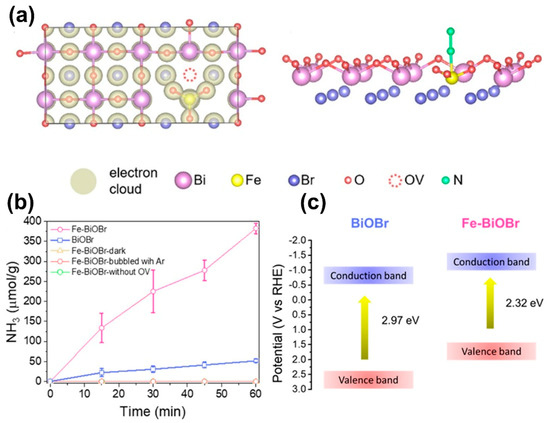- Liu, Y.; Hu, Z.; Yu, J.C. Fe Enhanced Visible-Light-Driven Nitrogen Fixation on Biobr Nanosheets. Chem. Mater. 2020, 32, 1488–1494. [Google Scholar] [CrossRef]
