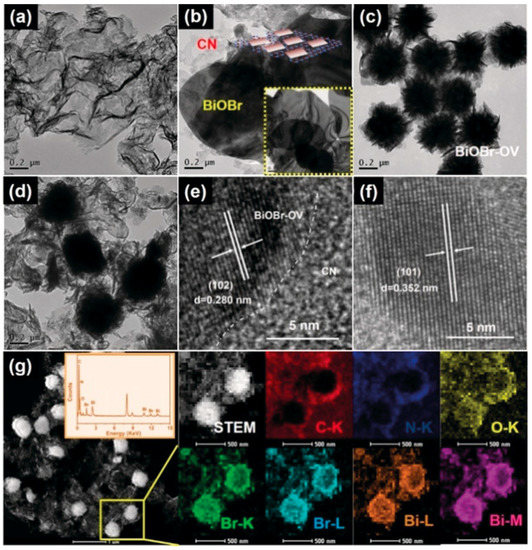 TEM analysis indicates the layered g-C3N4 structure with ultrathin nanosheets (Figure 10a), the nanoflower-like morphology of BiOBr enriched with oxygen vacancies (Figure 10c) and their perfect heterojunction, indicating the embedment of the oxygen vacancy enriched nanoflowers on g-C3N4 nanosheets (Figure 10d). Comparatively, the morphology of defect-free BiOBr/g-C3N4 indicates the formation of nanoplates, as observed from Figure 10b. HRTEM micrographs (Figure 10e,f) of oxygen vacancy enriched BiOBr/g-C3N4 depict the lattice spacing of d = 0.28 and 0.352 nm corresponding to the (102) and (101) crystal planes of the tetragonal phase of BiOBr, respectively. Further, the purity and co-existence of all the elements in BiOBr/g-C3N4 were confirmed from EDS elemental mapping, as shown in Figure 10g. The photocatalytic activity of oxygen vacancy enriched BiOBr/g-C3N4 in the removal of NO under visible light irradiation at 63% was 1.8, 1.6, 1.6 and 1.5 times greater than pristine g-C3N4, pristine oxygen vacancy enriched BiOBr, defect-free BiOBr/g-C3N4 and a physical mixture of g-C3N4 with oxygen vacancy enriched BiOBr. Similarly, photocatalytic CO2 reduction using oxygen vacancy enriched BiOBr/g-C3N4 generated CO and CH4 at a rate of 61.8 and 27.1 µmolh−1g−1, respectively, which was greater than the control samples. Abundant oxygen vacancies in BiOBr and the heterojunction with ultrathin g-C3N4 nanosheets were attributed to the enhanced photocatalytic activity, while the •OH and •O2− radicals were reported to be the main active species involved in the removal of NO and the reduction of CO2, respectively.