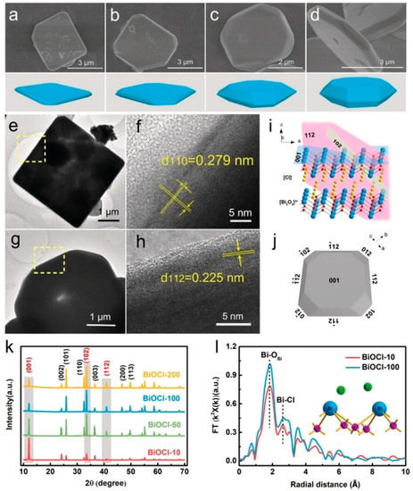 SEM images and the corresponding schematic representation for BiOCl treated at different time intervals (a) 10 h, (b) 50 h, (c) 100 h, and (d) 200h; (e) TEM image and (f) HRTEM image of BiOCl treated for 10 h; (g) spherical aberration correction TEM image and (h) HRTEM image of BiOCl treated for 100 h; (i) crystal structure and facets of BiOCl; (j) Schematic representation of the different facets of eighteen-faceted BiOCl; (k) XRD patterns of BiOCl series samples; (l) Fourier transformed profiles for Bi coordination environments in normalized Bi L3-edge XAFS spectra of BiOCl treated at 10 and 100 h. Reprinted from Ref. [192] with permission from John Wiley & Sons.