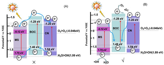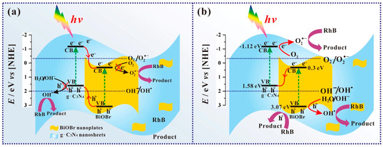 Since 2D nanostructures can offer an apt platform for establishing surface contact with other species, the idea of constructing a heterojunction by the hybridization of two types of 2D photocatalysts is an appropriate strategy for increasing the interface area. Recently, the combination of g-C3N4 with BiOX/BixOyXz for the construction of 2D/2D heterojunction photocatalysts has attracted considerable research attention [237,238,239,240]. Liu et al. reported the fabrication of a BiOBr/g-C3N4 heterojunction through a simple reflux process, and its photocatalytic performance was studied by the degradation of rhodamine B and bisphenol A under visible light irradiation. The enhanced photocatalytic performance of the heterojunction composite was obviously attributed to the efficient charge generation and separation, while the active species involved during the photodegradation of rhodamine B and bisphenol A were found to be in the order •OH > h+ > •O2−. For determining whether the photocatalytic mechanism followed the type-II heterojunction or Z-scheme system, the migration channel of the photogenerated electron-hole pairs was analysed through UV-Vis diffused reflectance spectroscopy and X-ray photoelectron spectroscopy. The results revealed that the values of CB and VB potentials of pristine BiOBr nanoplates were 0.30 eV and 3.07 eV, while those of pristine g-C3N4 nanosheets were −1.12 eV and 1.58 eV, respectively. After the hybridization of g-C3N4 with BiOBr, the VB edge of the BiOBr/g-C3N4 heterojunction was found to be shifted to 1.32 eV due to the alignment of the Fermi levels at the interface. Under visible light irradiation, the photogenerated electrons moved from the CB of g-C3N4 to that of BiOBr, while the photogenerated holes moved from the VB of BiOBr to that of g-C3N4 across the intimate well-aligned band structure due to the potential difference. As observed from Figure 12a, if BiOBr/g-C3N4 had formed a type-II heterojunction, the formation of •O2− and •OH would not have been possible due to the insufficient reduction and oxidation potential of BiOBr and g-C3N4. Therefore, the Z-scheme photocatalytic system was found to be constructed as shown in Figure 12b, wherein the electrons accumulated in the CB of g-C3N4 (−1.12 eV vs. NHE) reacted with oxygen molecules to form •O2−, and the holes in the VB of BiOBr (3.07 eV vs. NHE) reacted with OH− to generate •OH radicals [123].