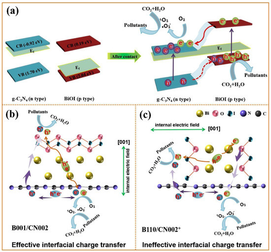 As shown in Figure 13a, the fermi energy level of BiOI as a p-type semiconductor is located close to the VB, while in the case of g-C3N4, it is located close to the CB and the energy levels of both the semiconductors achieve an equilibrium to form a (001)-BiOI/(002)-g-C3N4 p-n heterojunction photocatalyst. The formation of the p-n junction effectively separates the photogenerated electron-hole pairs in both the heterojunction photocatalysts, but the transfer rate of the photogenerated electrons was found to be distinctly different in the two heterojunctions. In the case of the (001)-BiOI/(002)-g-C3N4 p-n heterojunction photocatalyst shown in Figure 13b, the IEF of BiOI along the [1] direction lying perpendicular to the g-C3N4 nanosheets results in the rapid enrichment of the electrons on g-C3N4 that benefitted the subsequent reduction reactions for the generation of 1O2 and •O2− radical species. On the other hand, in the case of the (110)-BiOI/(002)+-g-C3N4 p-n heterojunction photocatalyst shown in Figure 13c, the charge transfer direction was parallel, and due to the long diffusion distance, some of the electrons recombined with the holes, leading to inefficient charge transfer in the heterojunction.