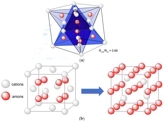 (a) Face-centred cubic stack of Ce4+ (white) with 100% Td sites occupied by O2− (red) and (b) simple cubic lattice of O2− with 50% of the cubic (eight-coordinated) sites occupied with Ce4. Adapted from [98].