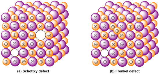 Intrinsic defects are present in ceria due to the alternative occupation and, thus, absence of cerium cations in the eight coordination sites. These defects can also be created by reactions with solids or the atmosphere [98]. Three different types of internal/subsurface defects observed in ceria include Frenkel (cation) defects, anti-Frenkel (anion) defects, and Schottky defects. Frenkel (or interstitial-vacancy pair) defects form when an atom or ion leaves its place in the lattice, occupies an interstitial site in a nearby location and creates a vacancy at the original site. Schottky defects form when oppositely charged ions leave their lattice sites, creating vacancy sites, and these vacancies form according to stoichiometric units to maintain an overall neutral charge in the ionic solid (Figure 3 [132]). In ceria, the energies of cation Frenkel defects (8.86 eV/per defect) and Schottky defects (3.33 eV) are higher than those of Frenkel oxygen defects (2.81 eV); hence, the most likely form of intrinsic disorders are Frenkel-type oxygen defects [133]. It has been reported that the predominant defects in ceria (and yttria-doped ceria) are anion vacancies [134], and the concentration of interstitial Ce defects was less than ~0.1% of the total defect concentration in CeO1.91 [135]. Anion Frenkel-type oxygen defects lead to the formation of pairs of oxygen vacancies and oxygen atoms in interstitial positions. These defects do not change the stoichiometric composition and usually have a low concentration. However, ceria can form a high concentration of vacancy defects by removing oxygen ions under a reducing environment, which induces the stoichiometry change from CeO2 to CeO2−x (0 < x < 0.5). In this case, the created oxygen vacancies need to compensate for the negative charges formed while removing oxygen. After oxygen is removed from the CeO2 lattice, the remaining electrons are associated with the change in the charge of the two cerium atoms from +4 to +3. This process is illustrated in Equation (6):