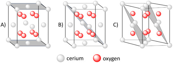 Different families of CeO2 planes: (A) (100), (B) (110) and (C) (111). Adapted from [133].