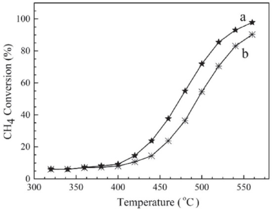 CH4 has a relatively strong C–H bond (450 kJ/mol) [21] and is the most difficult alkane to oxidize completely. Therefore, the catalytic oxidation of methane is the best approach for the dissociation of C–H bonds, the oxidation temperature being thus considerably reduced [22,23]. It has been confirmed that the catalytic oxidation of methane is an efficient method for capturing low-concentration methane [24,25]. This environmentally friendly technology offers the possibility to produce heat and energy at much lower temperatures than conventional thermal combustion. Moreover, catalytic combustion or oxidation is viewed as a viable approach to resolve this important environmental problem, at least in the short term [21,23,26].