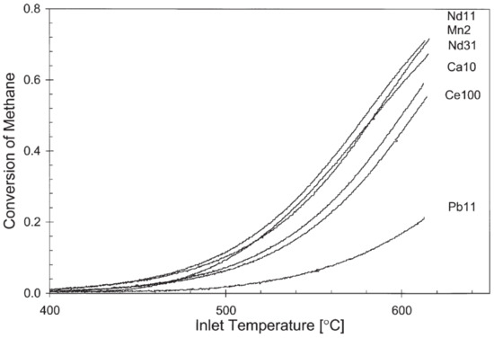 Work [153] regarding the design of ceria catalysts was conducted by preparing samples of doped CeO2 with an alkaline earth metal (Ca), rare earth metal (Nd), a transition metal (Mn) and a p-block metal (Pb), then comparing their catalytic activities in methane combustion to that of an undoped CeO2 sample [153]. The oxide catalysts were prepared via a hydrothermal method where solution of metal nitrates was treated with 0.2 M ammonium oxalate solution so that the metal oxalates coprecipitate, after which they were calcined for 4.5 h at 600 °C in air.