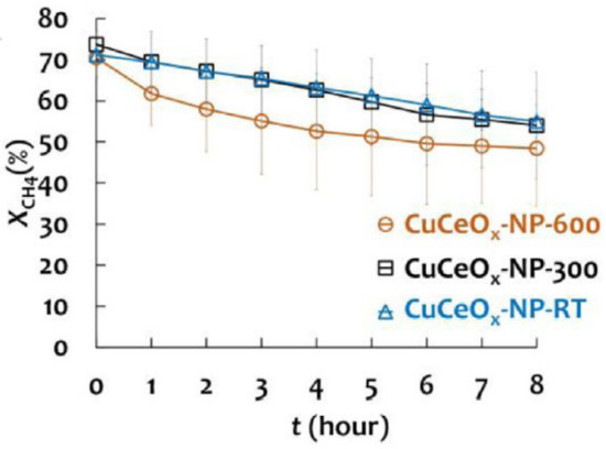The as-prepared catalysts were tested in methane conversion in the temperature range 300–650 °C, achieving complete oxidation of the hydrocarbon with CO2 and H2O as the only products (Figure 10). Except for CuO/CeO2(c), Cu-doped catalyst series exhibited higher activity than pure CuO and, among them, CuO/CeO2(t1) had the highest catalytic activity which decreases in the following order: CuO/CeO2(t1) > CuO/CeO2(s) > CuO/CeO2(h) > CuO/CeO2(t2) > CuO/CeO2(c).