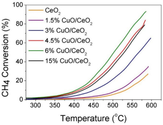 This study also evidenced the effect of Cu loading on the best performing ceria support (CeO2 obtained from cerous nitrate, Ce(NO3)3·6H2O, thermal decomposition), CeO2(t1), on the efficiency in methane combustion (Figure 11). The catalytic activity increased naturally with Cu loading on the support until it reached 5 wt%; after this point, the catalysts with 10% and 15% Cu showed similar activities to that of 5 wt%. This behavior suggested that a maximum dispersion of CuO particles onto the support surface is reached at 5 wt% with no more beneficial effect on the catalytic activity as the Cu loading increased, indicating a saturation of the surface in the active phase. Hence, at larger Cu content, a layer of bulk-like CuO formed besides the existing highly dispersed monolayer, which provides the maximum catalytic activity.